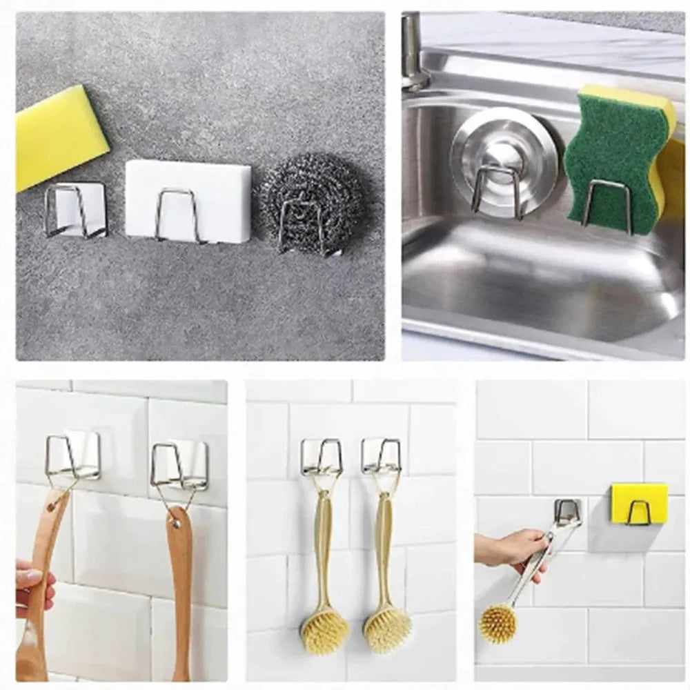 Soporte de acero inoxidable adhesivo para esponjas de acceso, hecho de material de alta calidad y cinta adhesiva resistente. Multifuncional, se puede utilizar para colgar esponjas, paños de cocina, tapones de fregadero, espátulas, cepillos, tablas de cortar, etc. Drena bien gracias a su diseño en forma de U y no daña la pared ya que solo necesitas despegar la cinta adhesiva, pegar en el fregadero limpio y seco. Con su tamaño compacto de 1,929 x 1,929 x 1,063 in es perfecto para ahorrar espacio.